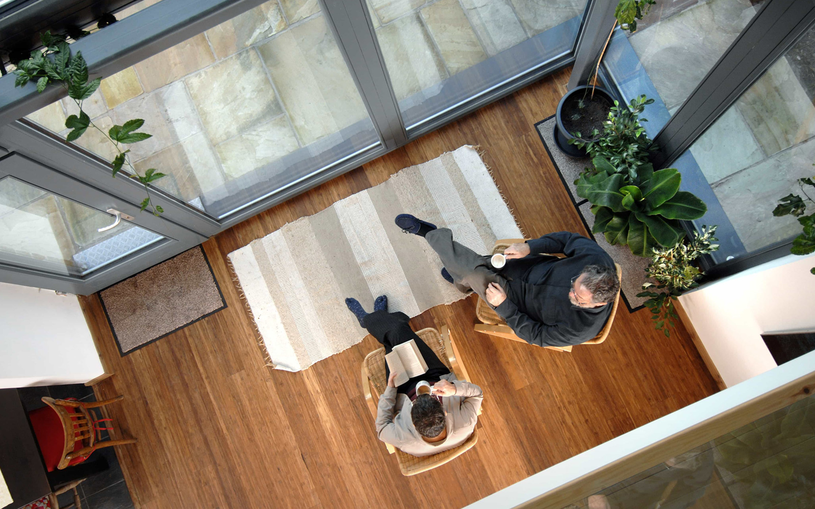 Passive house triple glazing provides a calm, extremely quiet environment. However, the way we have designed it on the inside with wood floors throughout and the open plan layout, means that any noise created echoes throughout the house. We shall see if we can live with this, or whether in time we will feel the need to close off the kitchen or lay more carpeting.