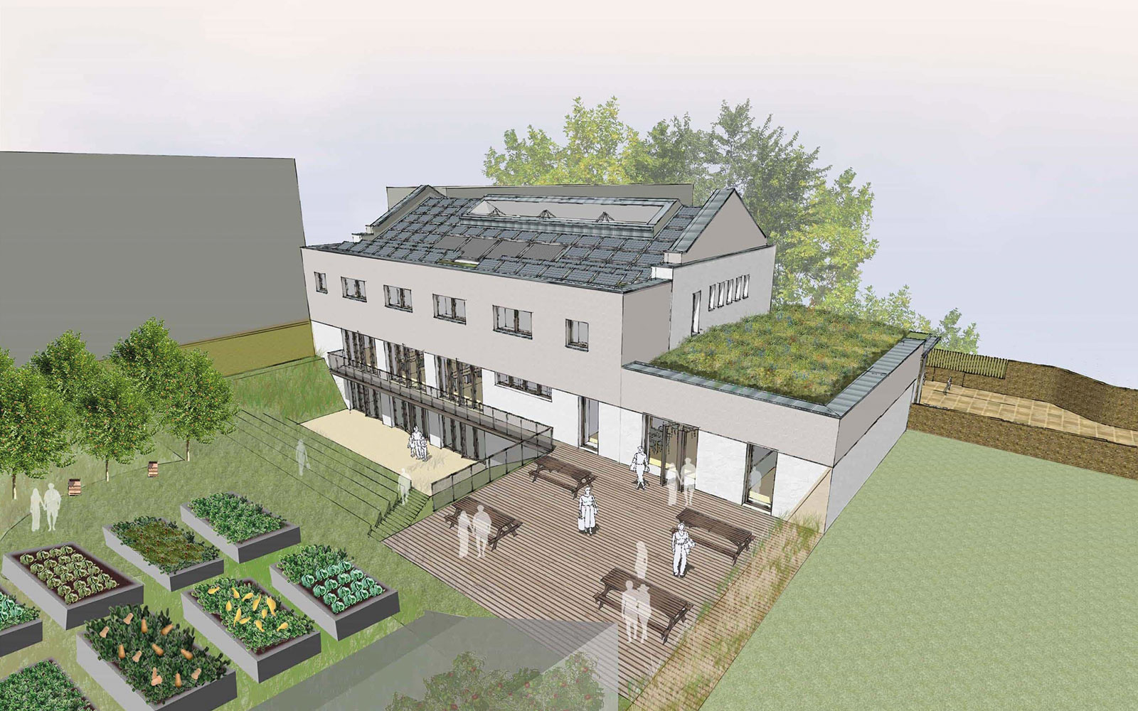 To help achieve the Passivhaus standard the building was orientated due south. The main block was positioned in the optimum location for solar gain with the main facade facing south. It was important that the house had a close relationship with the woodland. To achieve this, the ground floor study area was designed to protrude from the house into the woodland to tuck into the trees. The block also wraps around towards the South to enclose the garden space.