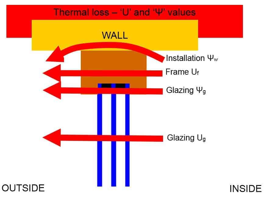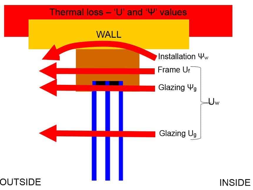 Psi is a Greek letter, given as ψ, and it simply denotes heat loss over a given length rather than area. So at the edge of the glass there is some extra heat loss because the edge of the glass is not as good an insulator as the rest of the glass. This heat loss we give as heat loss per metre of glass edge per degree temperature difference between inside and outside, so W/m.K. This is ψg. We have the same thing for the window installation and this is given as ψw.